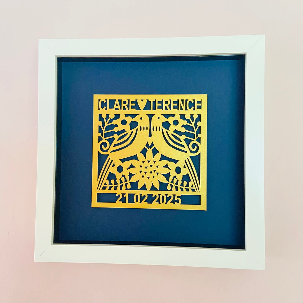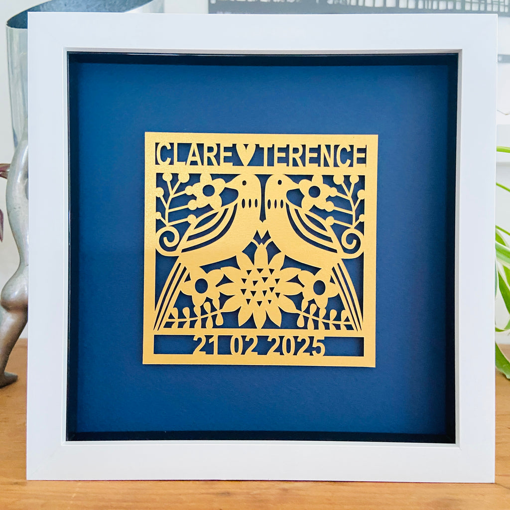 Celebrate a special love story with this handcrafted personalised papercut artwork, featuring two lovebirds, floral details, and custom names and date. Perfect as a wedding, anniversary, or engagement gift, this elegant design is cut from metallic gold paper and beautifully framed to create a timeless keepsake.