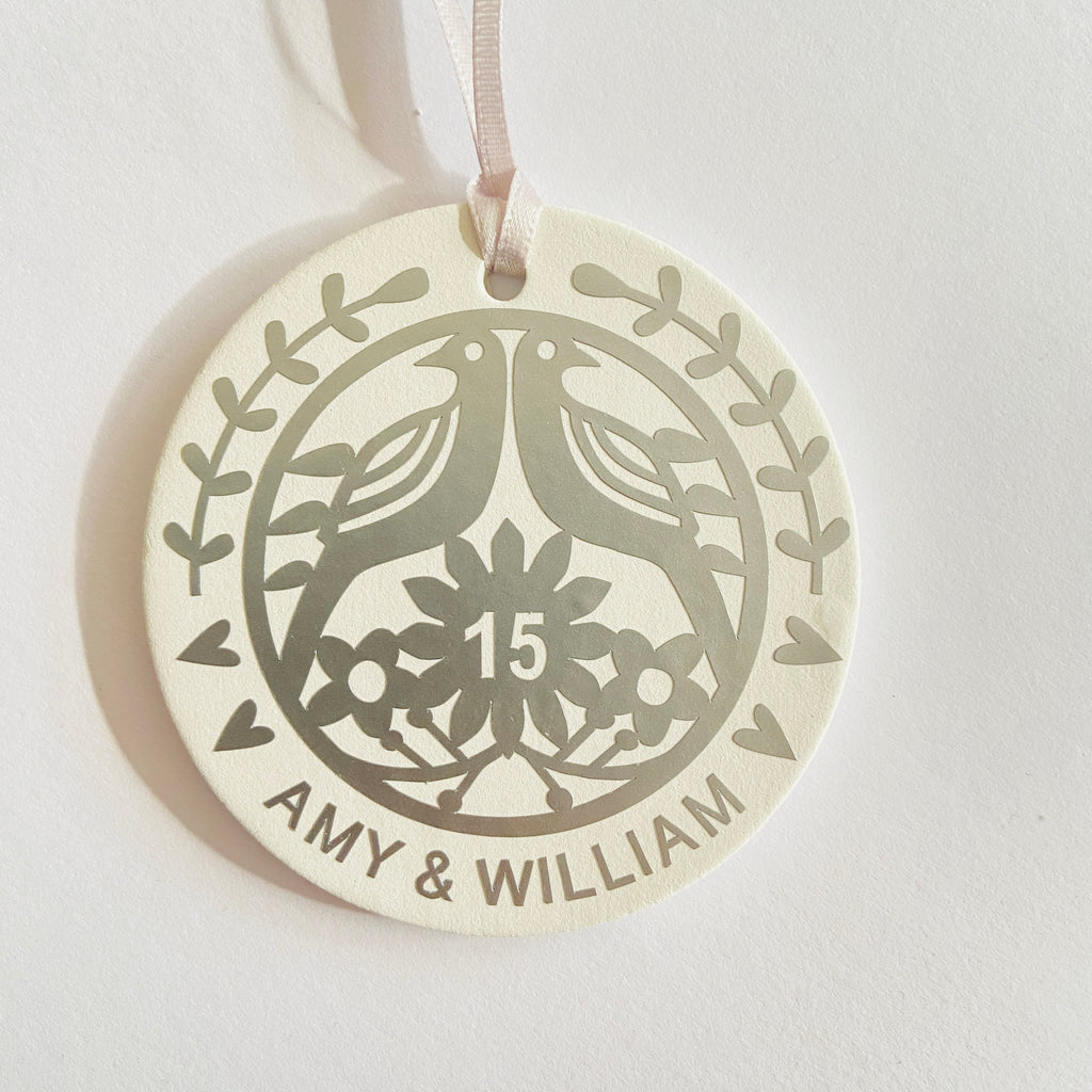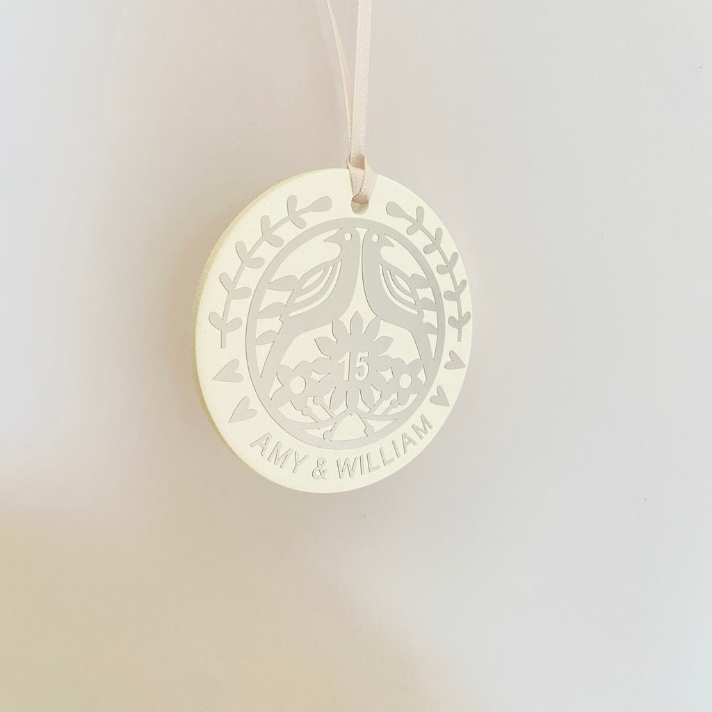 Perfect as a gift for a couple or a special decoration to mark your own anniversary, it comes finished with a ribbon for easy hanging and presentation.
