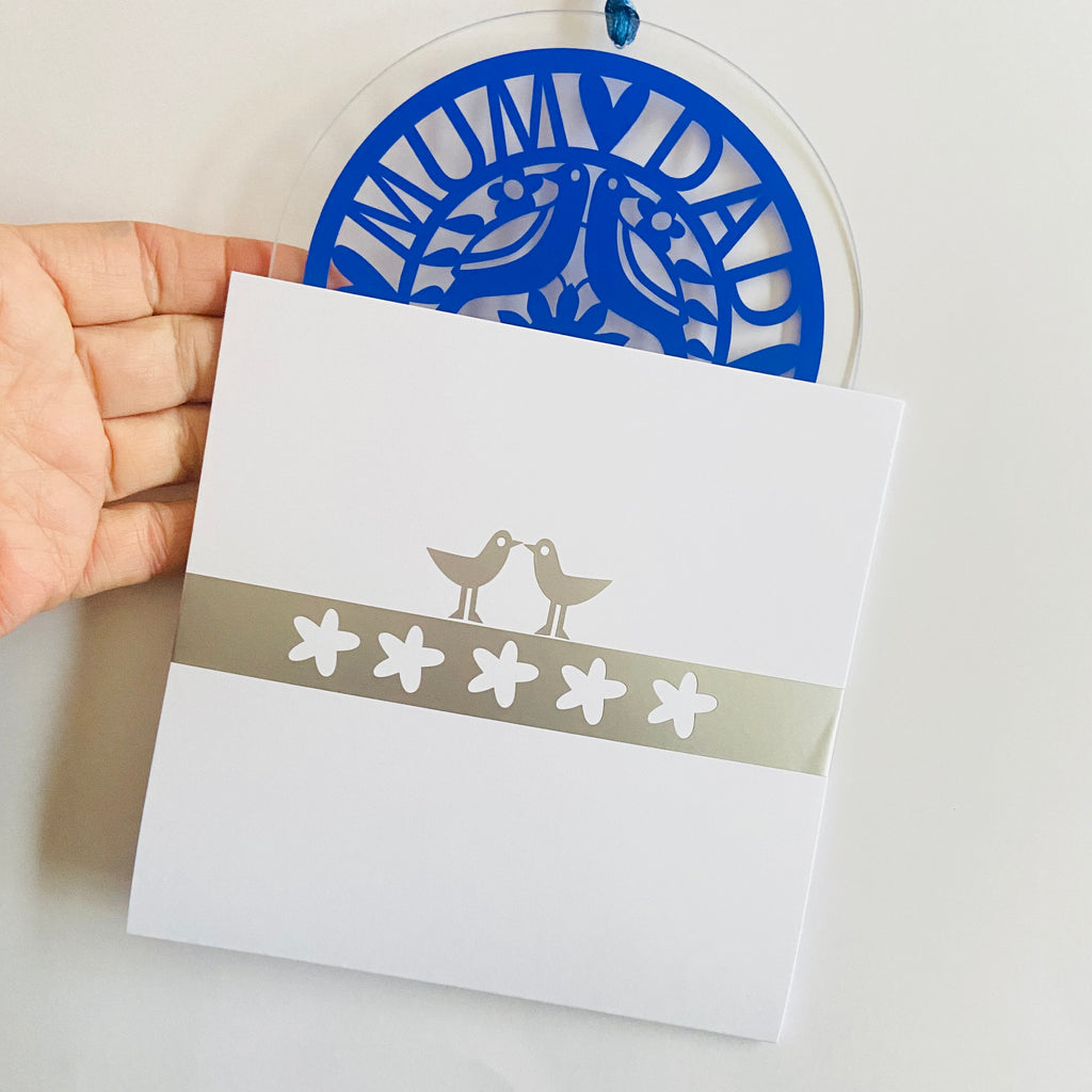 Glass hanging decoration which is made from a delicate cut out blue stencil onto a glass circle and presented in a quirky and imaginative package.